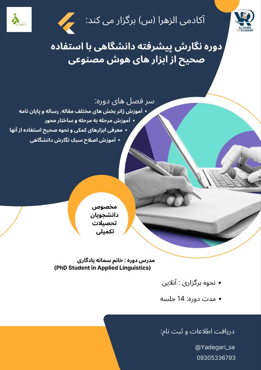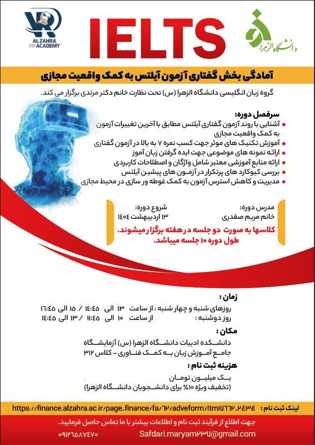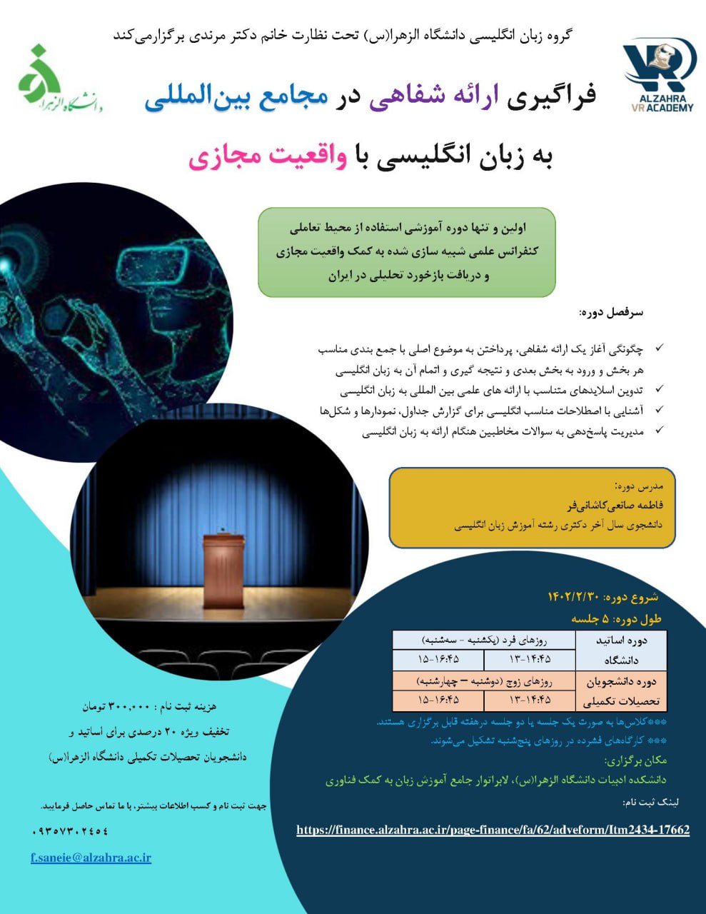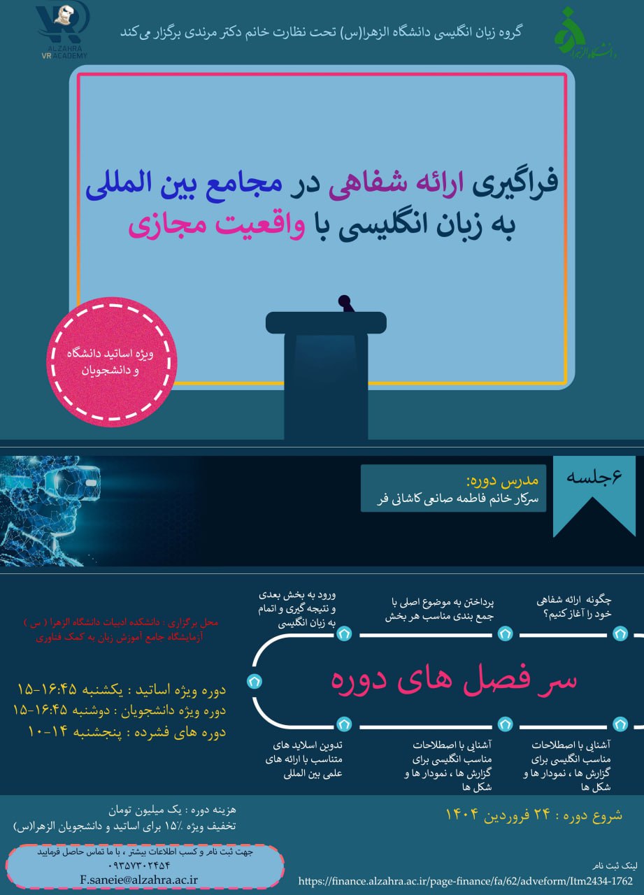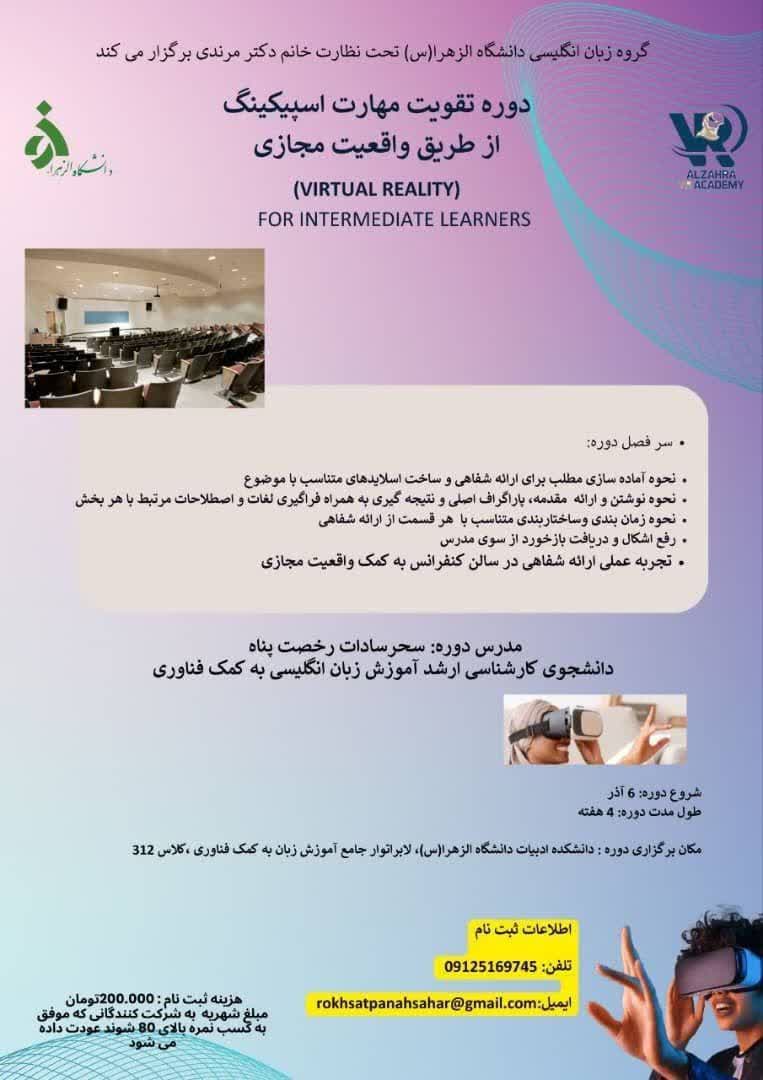 آکادمی الزهرا (س)، با هدف نوآوری در آموزش زبان، دورههایی ترکیبی از فناوری و یادگیری ارائه میدهد. ما با استفاده از واقعیت مجازی، تجربهای واقعی و تعاملی برای زبانآموزان فراهم کردهایم. اگر درباره دورهها، اساتید یا شیوه ثبتنام سوالی دارید، خوشحال میشویم پاسخگو باشیم.